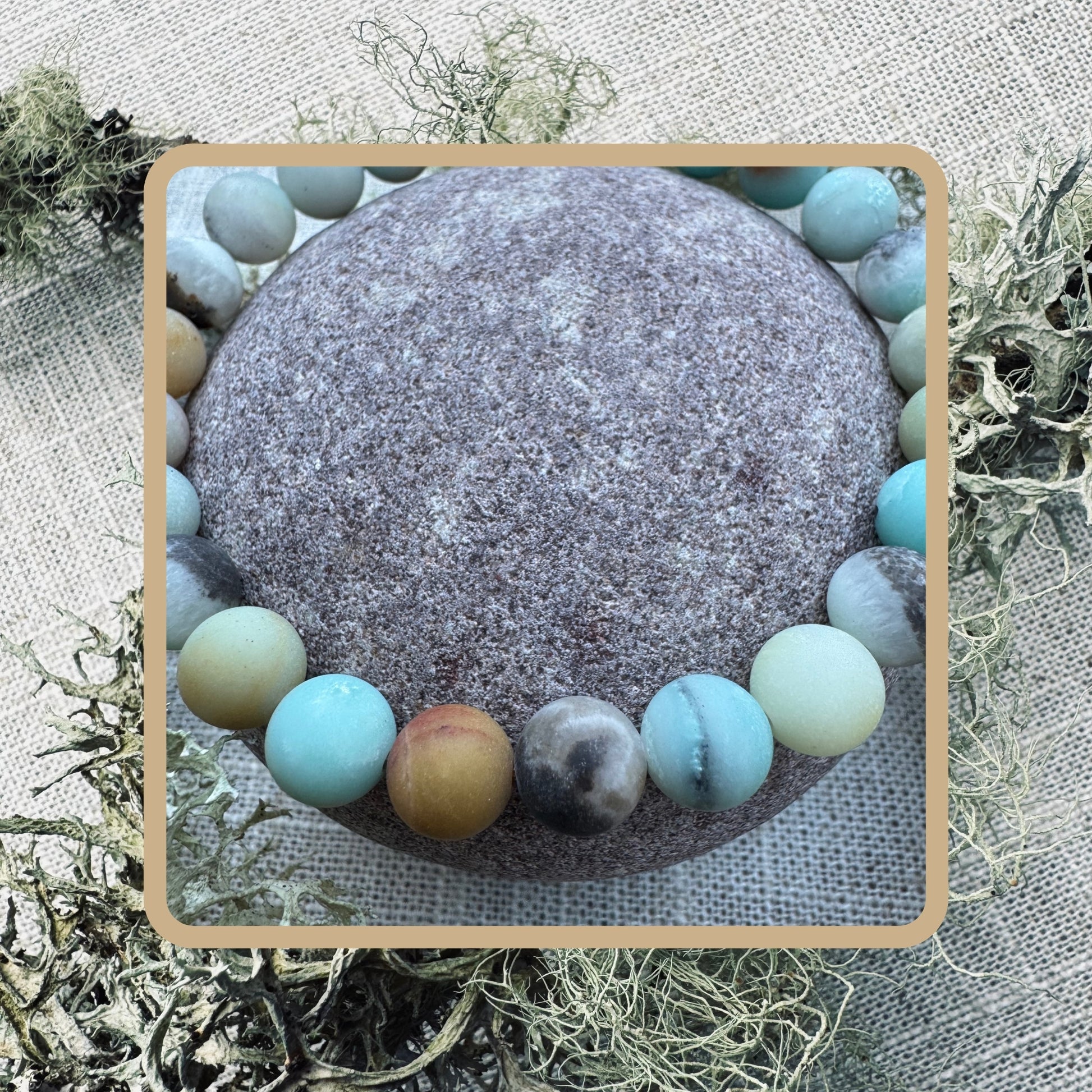 Strung on strong, flexible elastic for a comfortable fit, the bracelet is accented with 24kt gold-filled beads that add a warm, luminous touch — like sunlight catching on weathered stone. Together, the elements create a piece that feels both grounded and timeless.