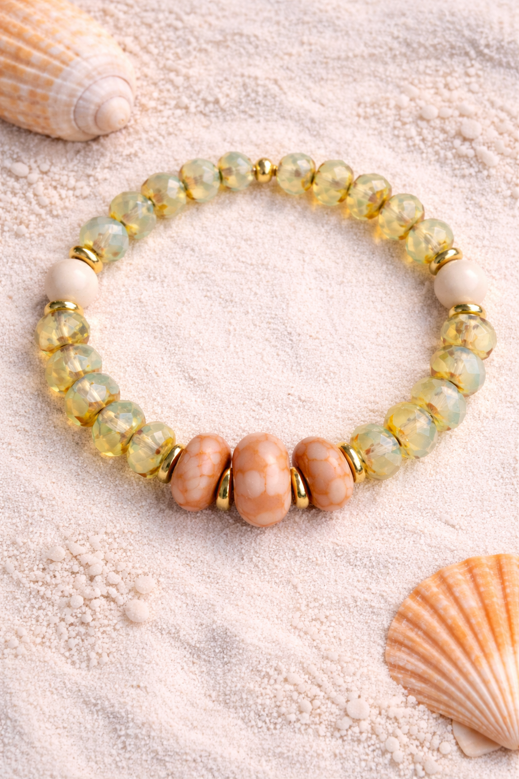 Hand-beaded onto strong elastic for ease of use, this bracelet is accented with 24kt gold plated spacers and brass coated beads.