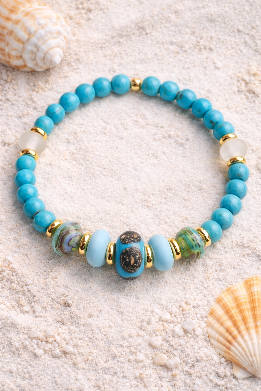 Each bracelet in this collection is one of a kind, crafted from a unique mix of lamp work beads, stone and faceted glass beads