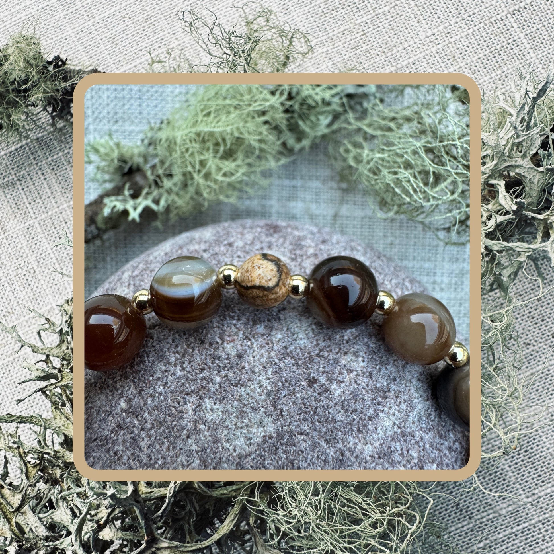 Highland Hearth – Hand-Beaded Elastic Bracelet - Inspired by the warmth of peat fires and the layered textures of Highland earth, Highland Hearth is a handcrafted bracelet that speaks to comfort, grounding, and timeless connection. Strung on strong, flexible elastic, it features Coffee Striped Agate stone beads, with rich, natural banding in tones of espresso, cream, and caramel — reminiscent of ancient rock formations and forest floors dappled in light.