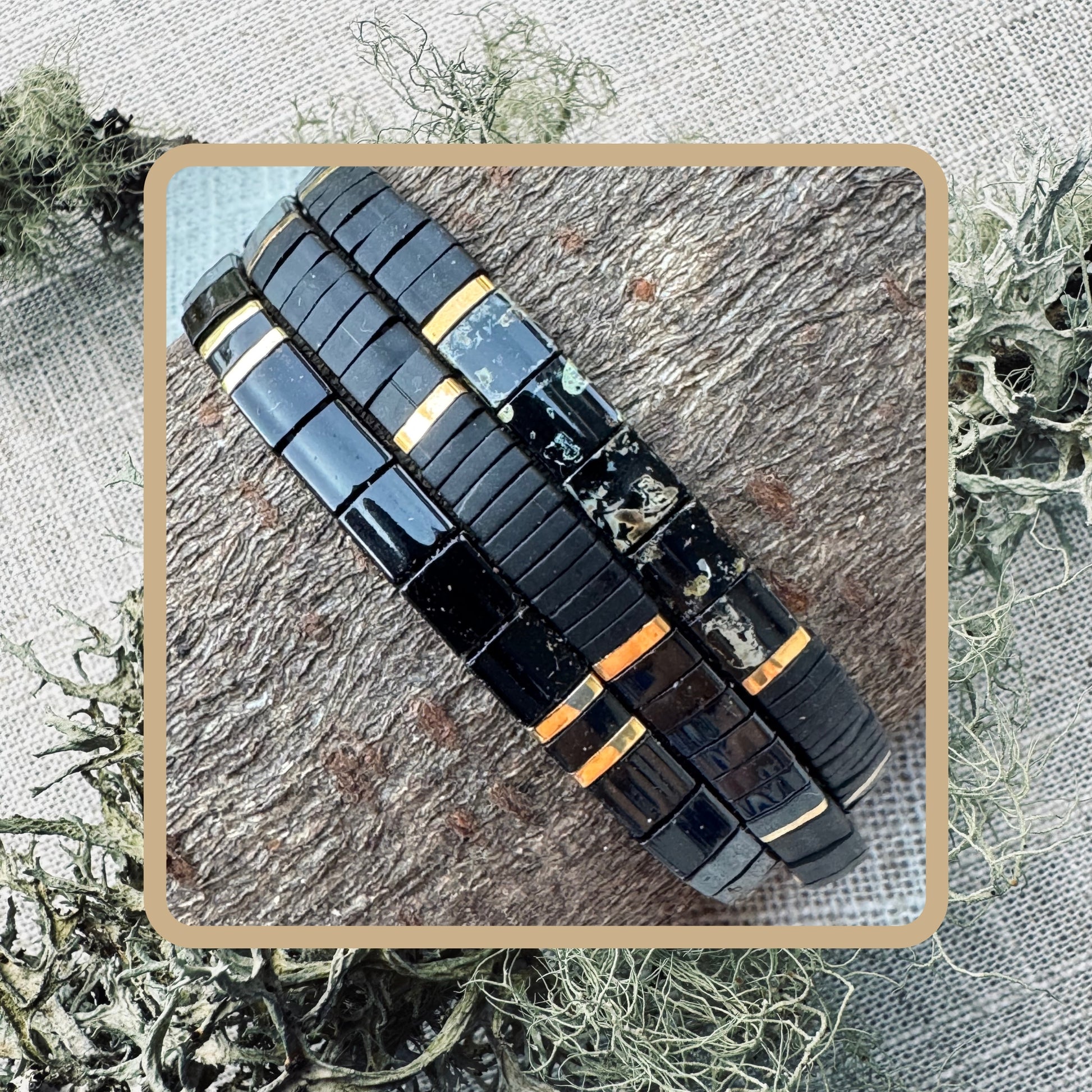 Hand-beaded onto strong elastic for ease of use, this bracelet is accented with 24kt gold plated spacers and gold-filled beads.