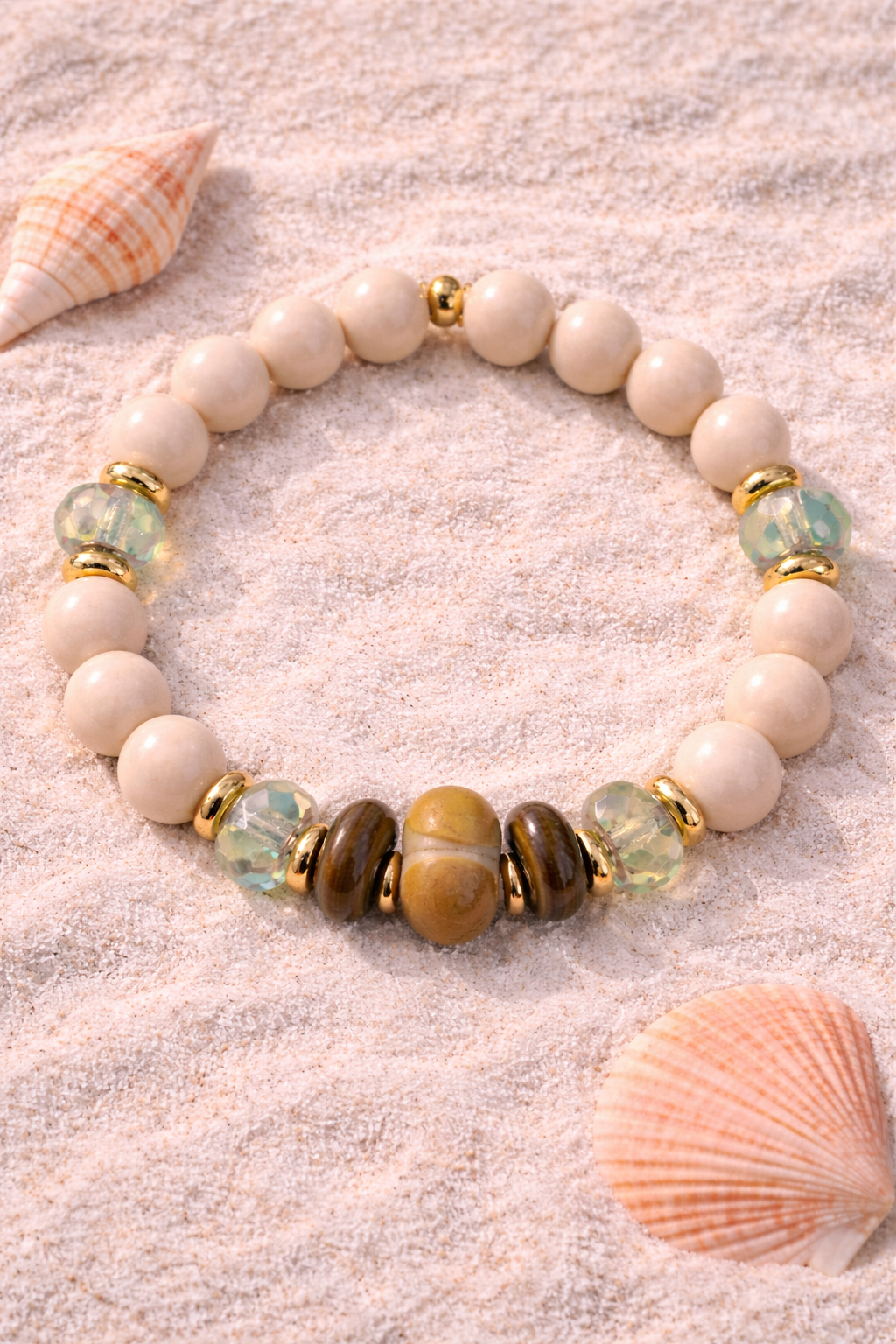 Hand-beaded onto strong elastic for ease of use, this bracelet is accented with 24kt gold plated spacers and brass coated beads.