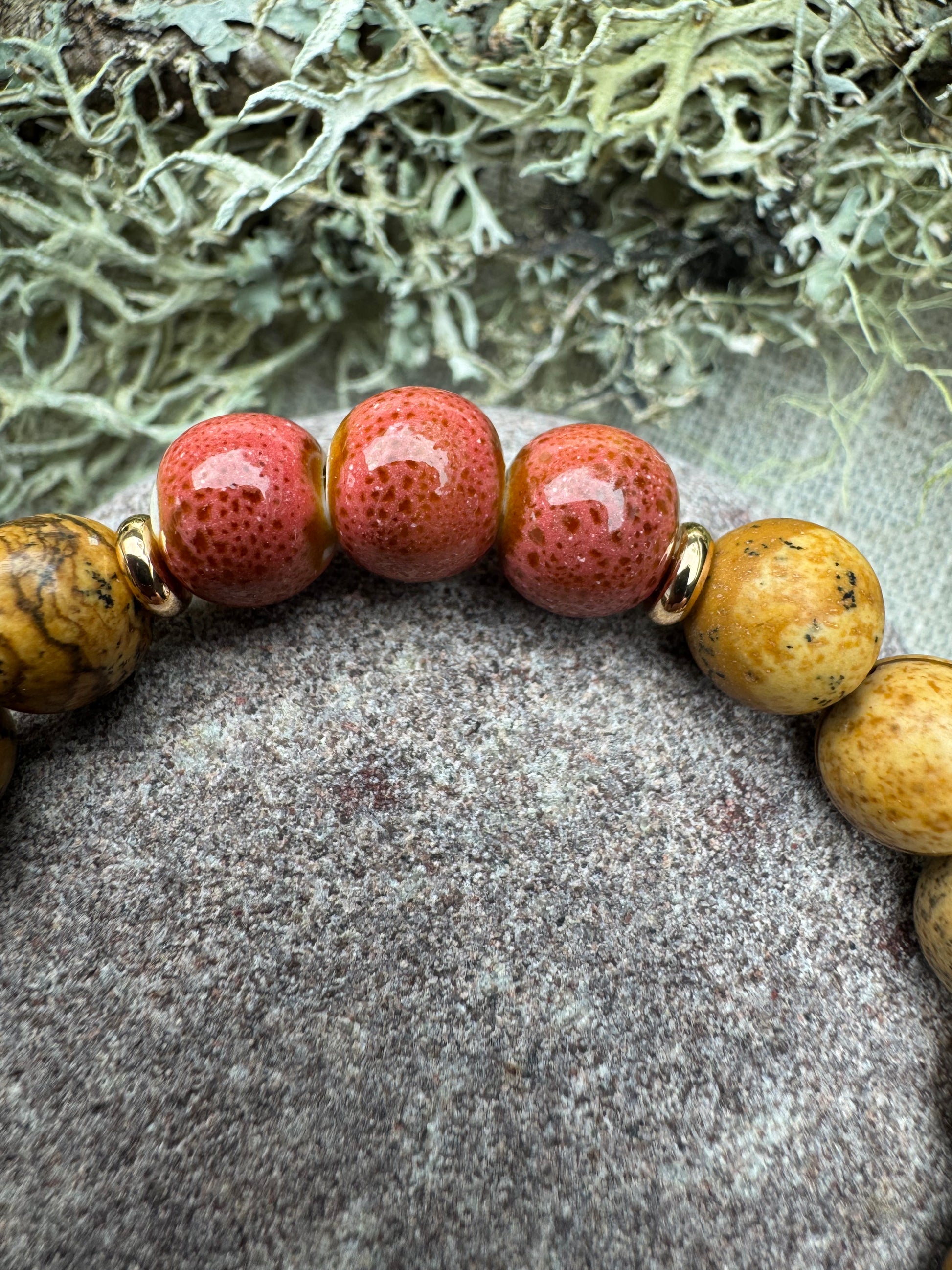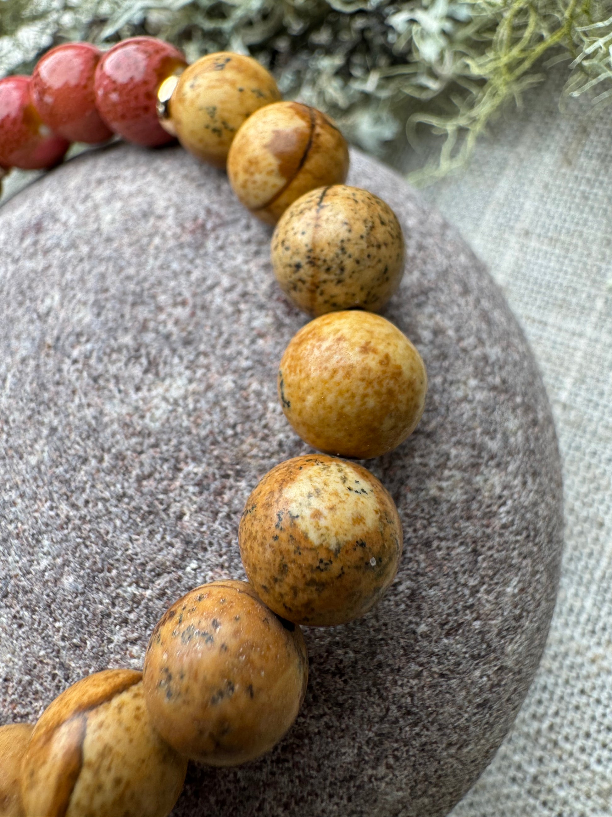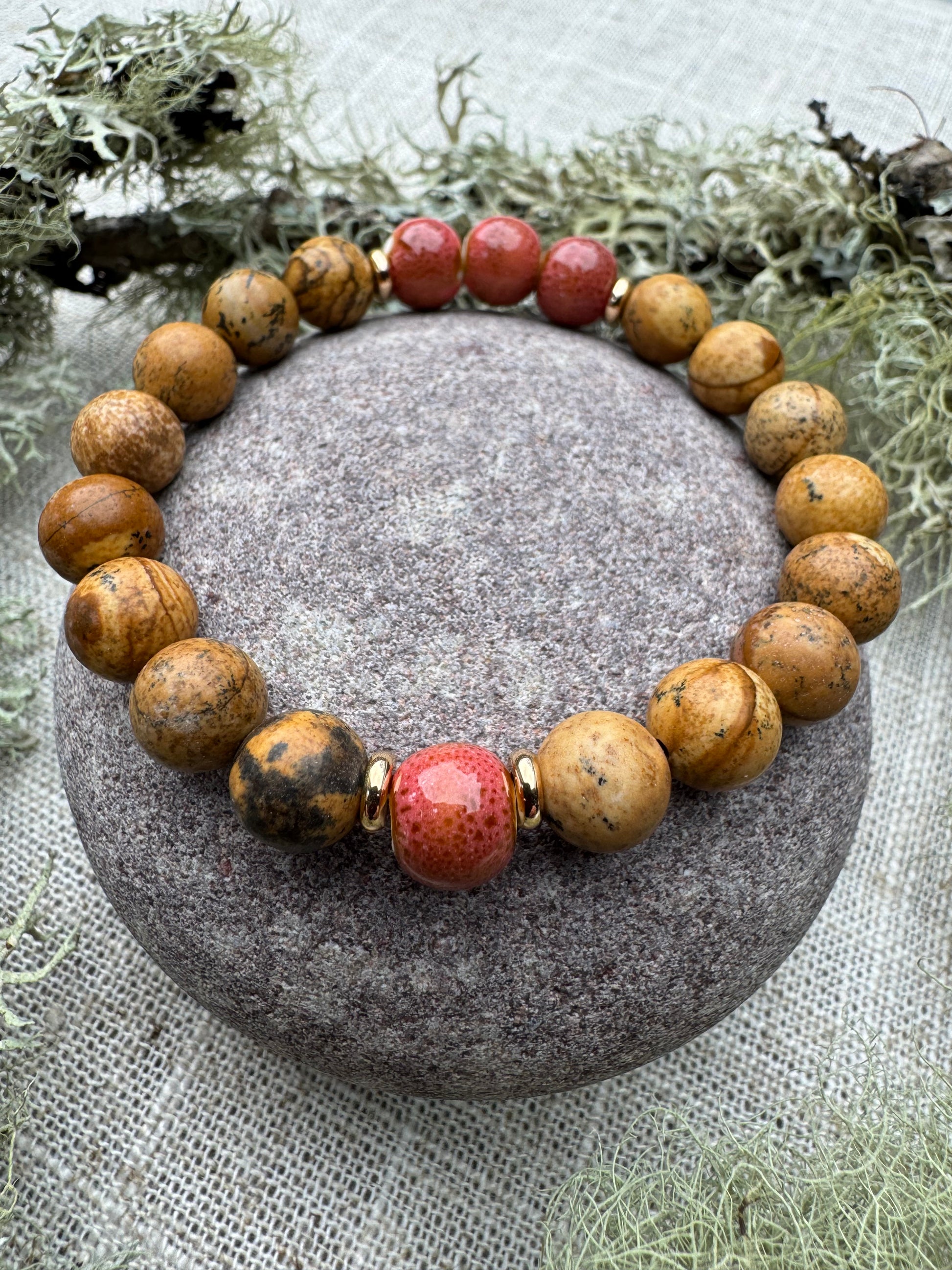 Bold and elemental, Highland Flame is a handcrafted bracelet born from the warmth of hearth fires and the fiery hues of Highland sunsets. Featuring Picture Jasper and red ceramic beads.