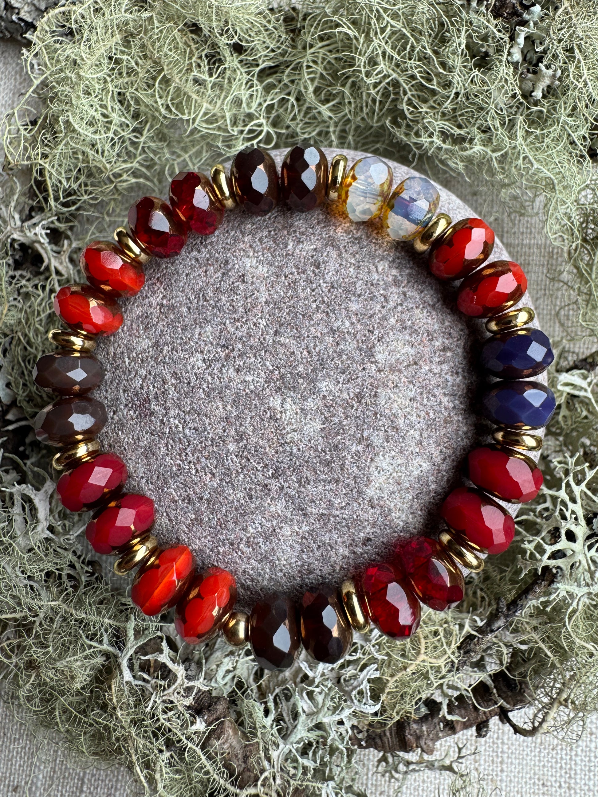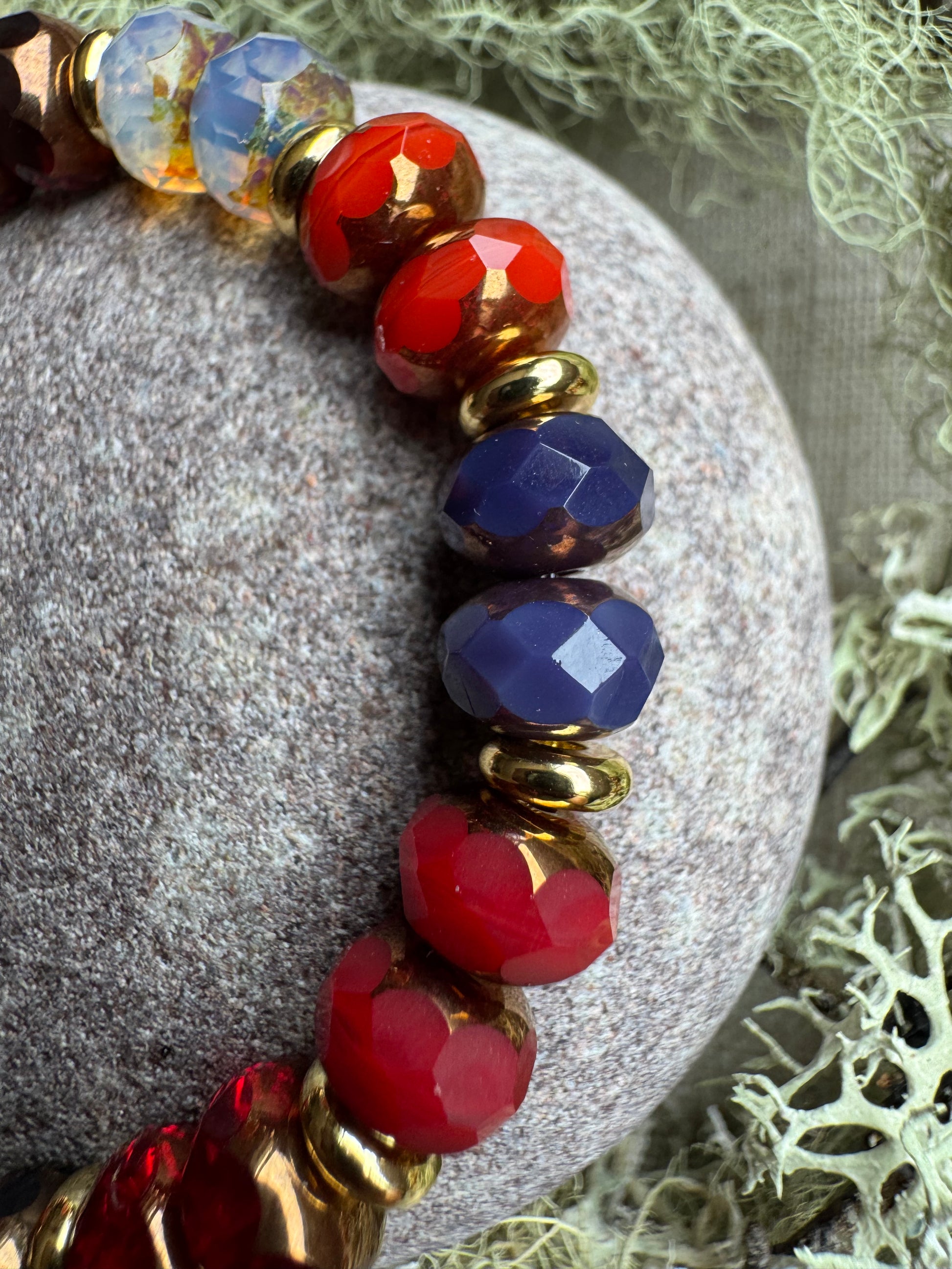 Each bracelet in this collection is one of a kind, crafted from a unique mix of faceted glass beads—some opaque, some translucent, all full of light and color.