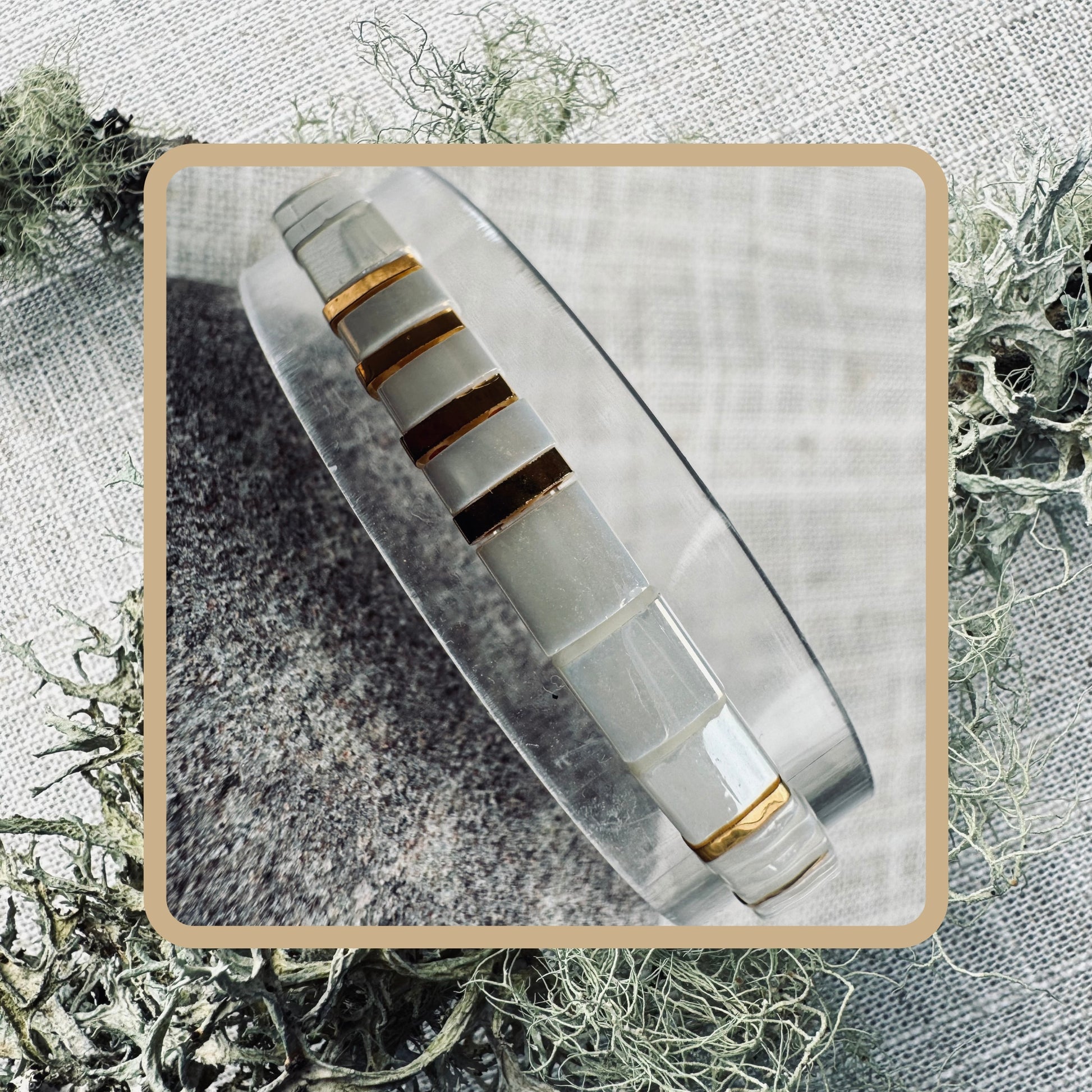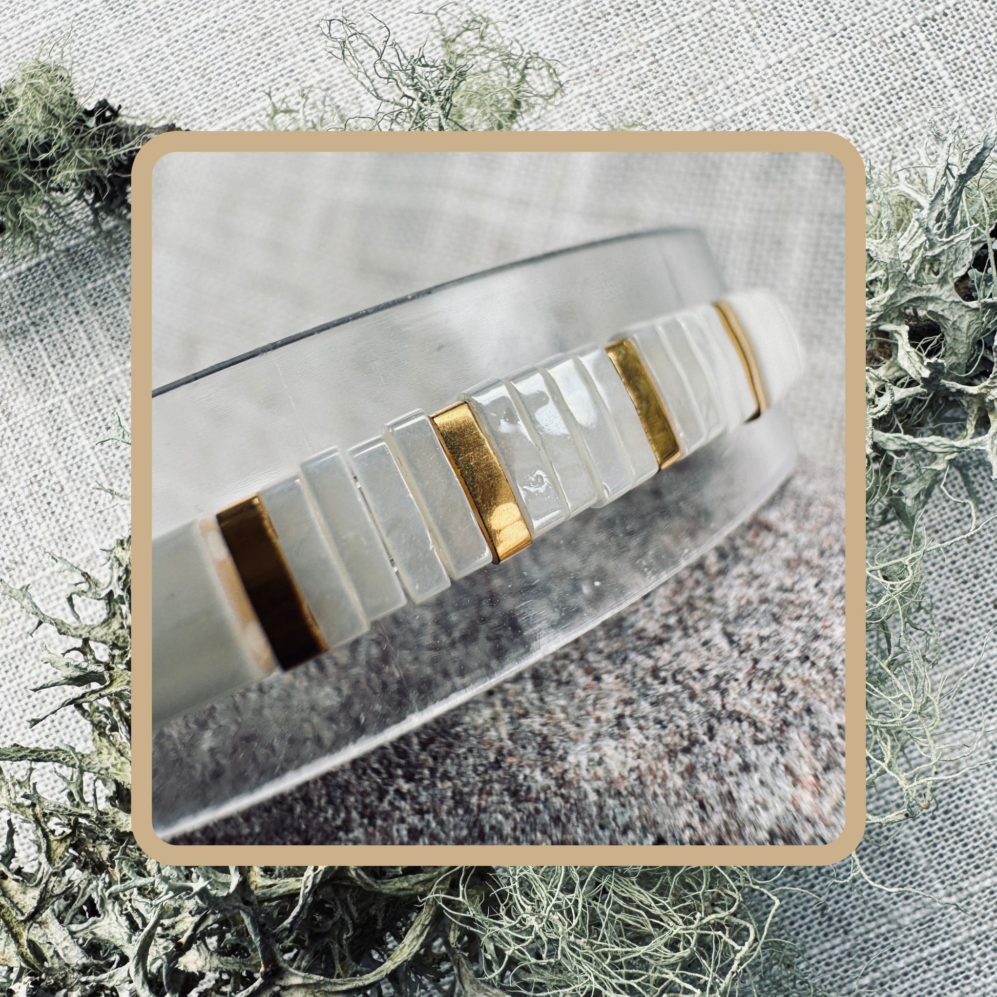 Hand-beaded onto strong elastic for ease of use, this bracelet is accented with 24kt gold plated spacers and gold-filled beads.