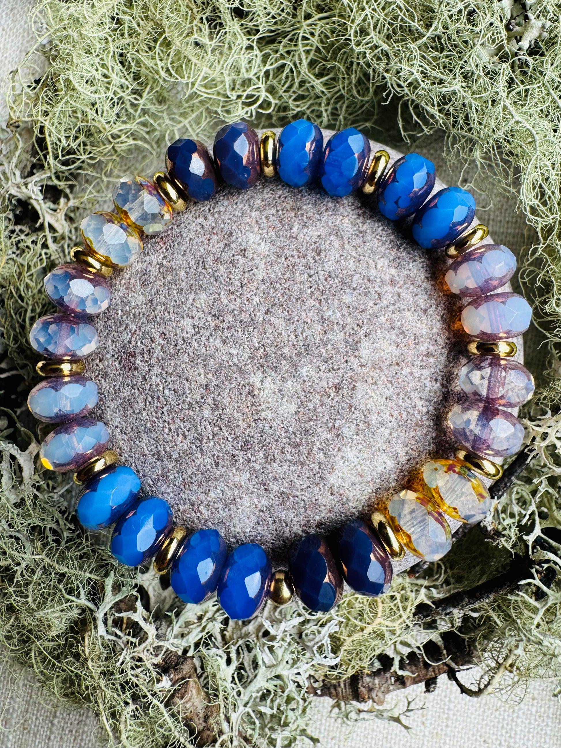 Each bracelet in this collection is one of a kind, crafted from a unique mix of faceted glass beads—some opaque, some translucent, all full of light and color.