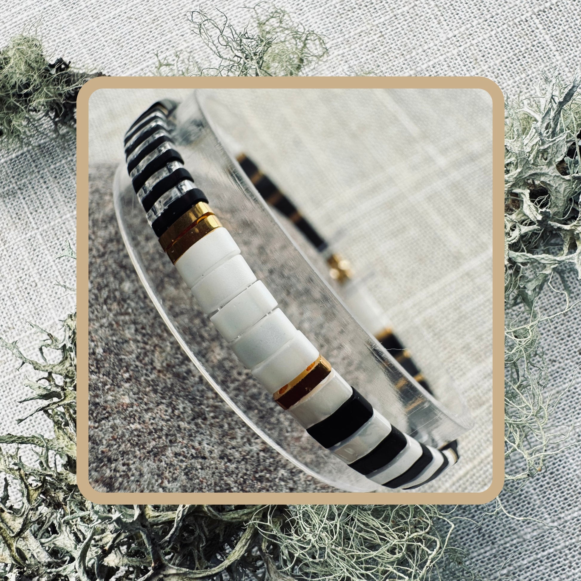 Hand-beaded onto strong elastic for ease of use, this bracelet is accented with 24kt gold plated spacers and gold-filled beads.