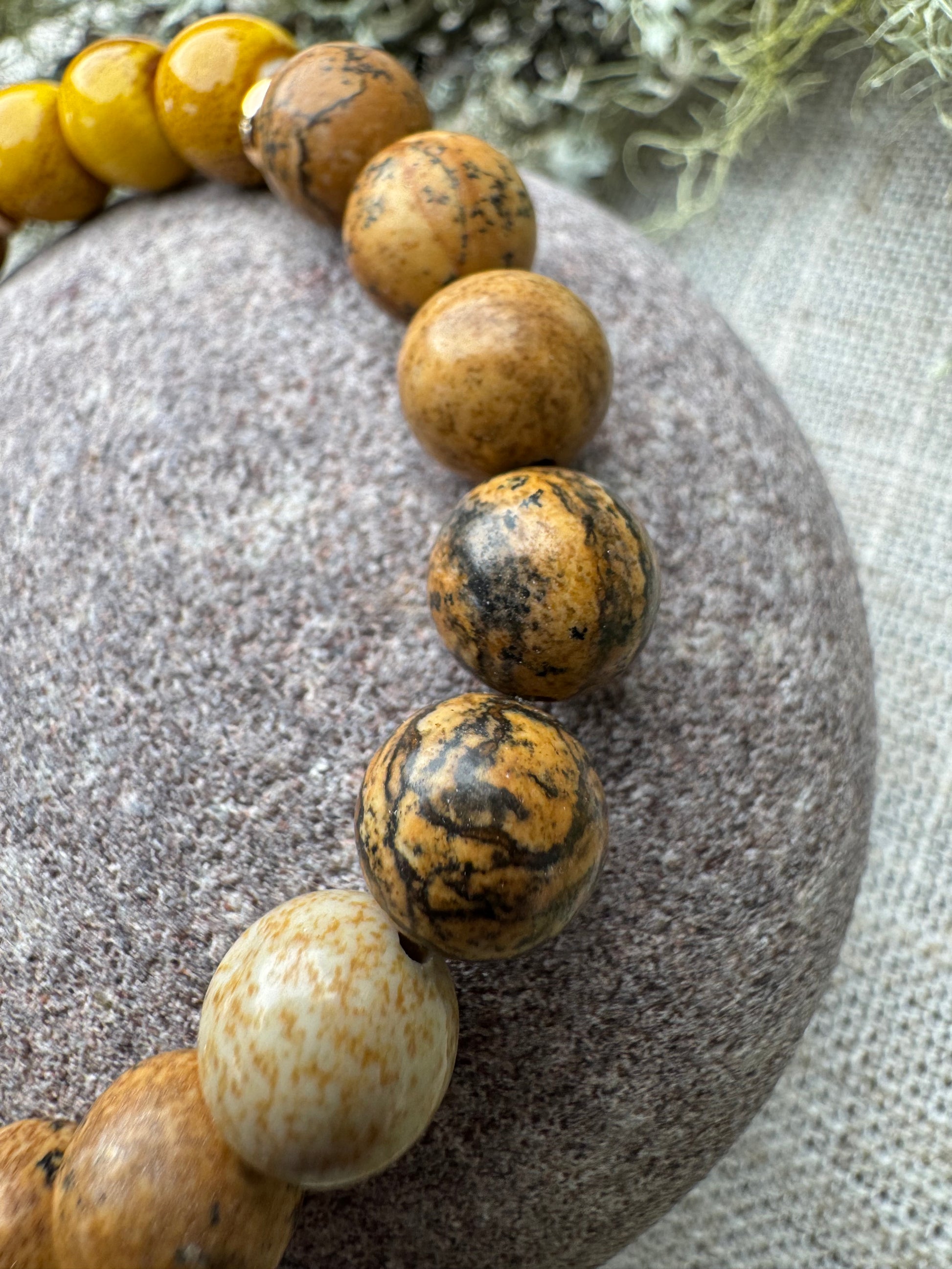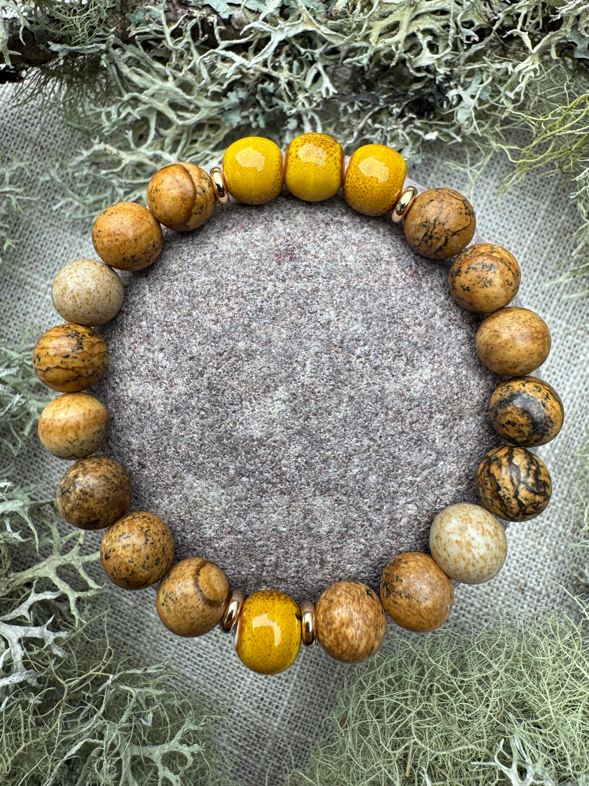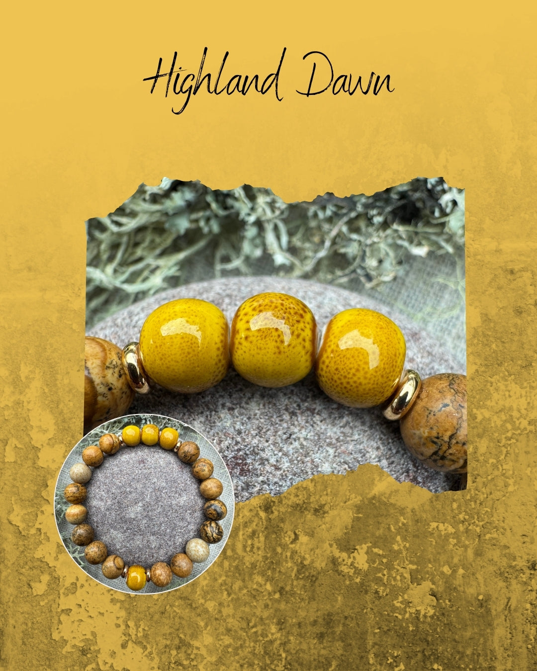 Soft and radiant, Highland Dawn is a handcrafted bracelet inspired by golden light rising over misty moors and quiet hills. Featuring Picture Jasper and yellow ceramic beads.